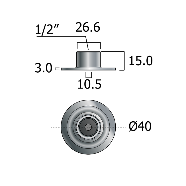 | Produktspezifikation | Grundplatte Rund mit aufgeschweisster Muffe Verzinkt Leichte Ausführung: 1/2" | 40mm x 3.0mm |