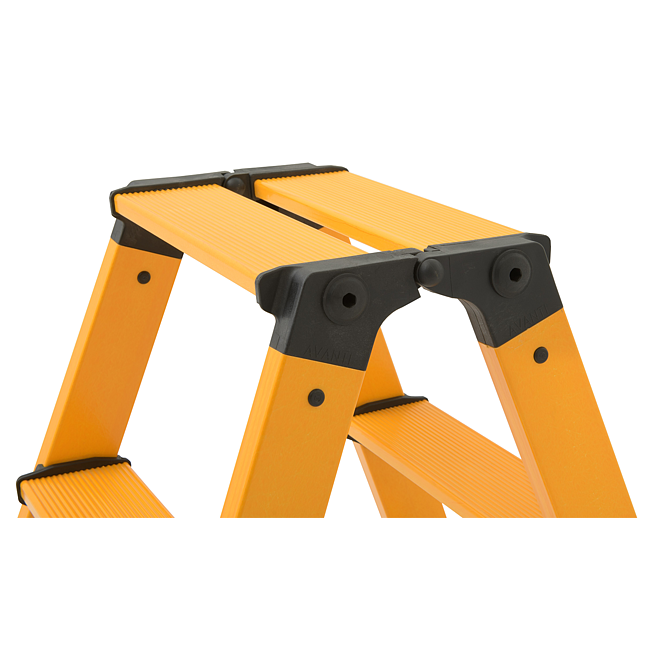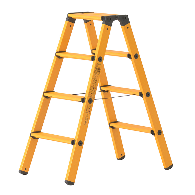 Die Hymer GFK Stufenstehleiter, beidseitig begehbar, ist aus robustem glasfaserverstärktem Kunststoff gefertigt und erfüllt die EN 131 Zertifizierung. Sie hat eine maximale Tragkraft von 150 kg und ermöglicht einen Zugang von beiden Seiten. Die Leiter ist 1,17m hoch, 0,50m breit, 1,25m lang, und bietet eine Reichhöhe von bis zu 2,72m. Sie verfügt über 2x5 Stufen und ist ideal für sicheres Arbeiten unter Spannung bis 1000V.