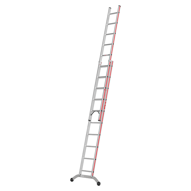 Sprossen aus stark profiliertem Strangpressprofil, daher erhöhte Rutschfestigkeit. Hochwertige Stahlbeschläge mit Kunststoffgleitern (erleichtertes Ein- & Ausfahren der Leiter). Mit gebogener Traverse (125mm Bodenfreiraum).
