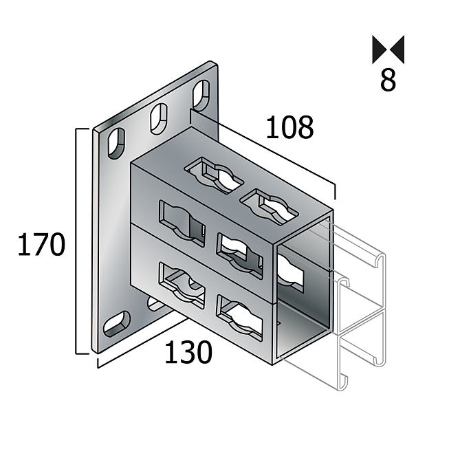 | Produktspezifikation | Schienenfuss | Wandflansch Feuerverzinkt Längs (Profi Knopf-System): 41x82 | Locher Nr. 4 | 3D Längs |